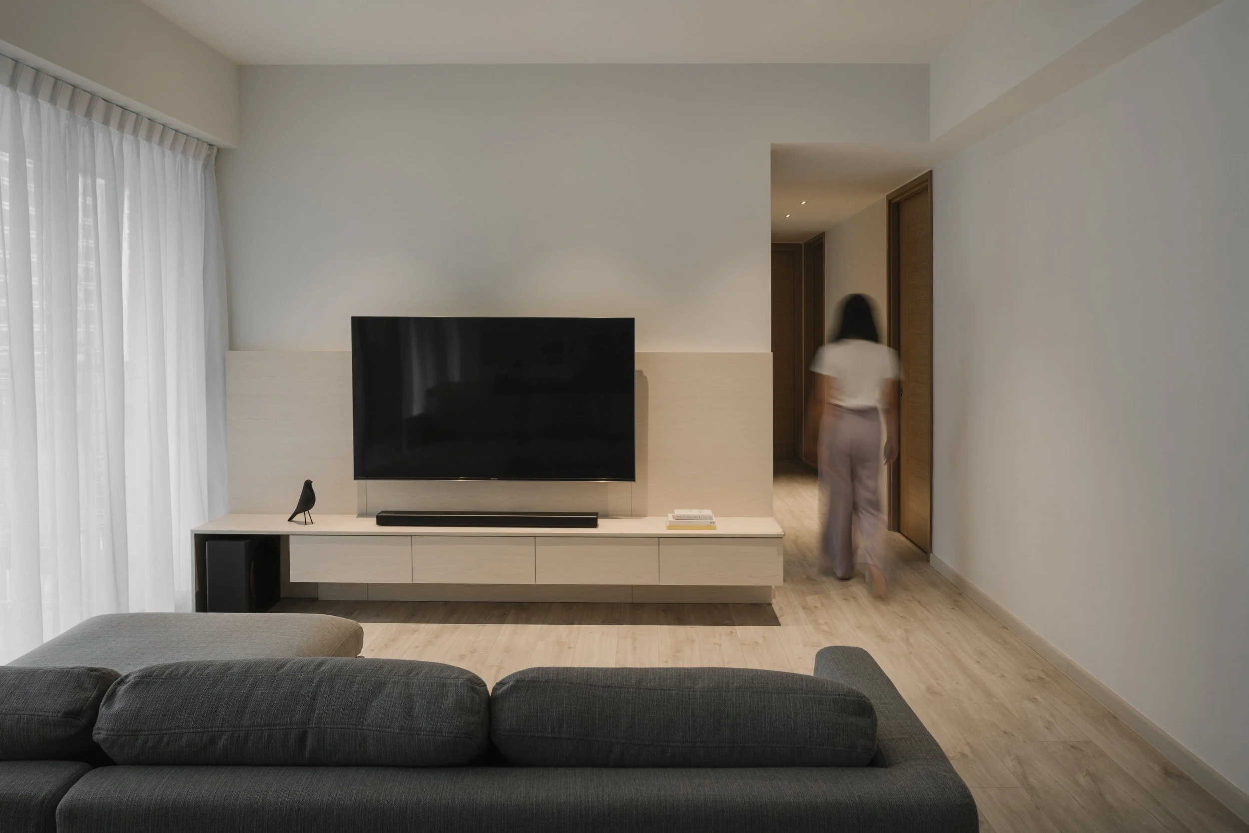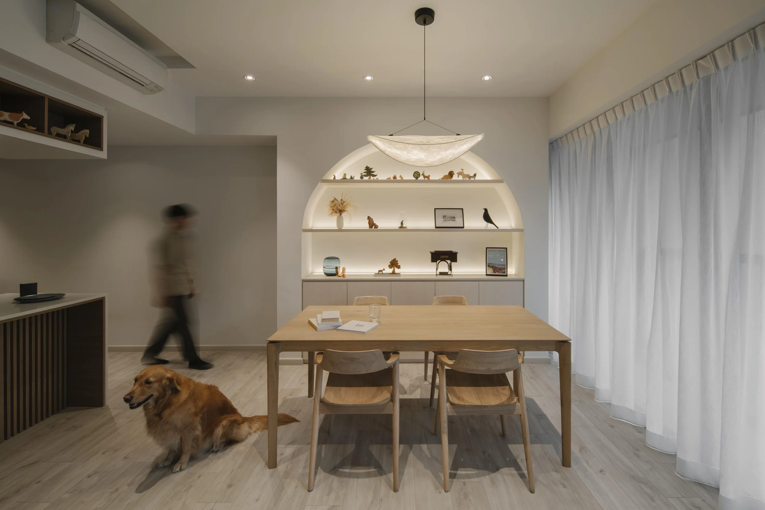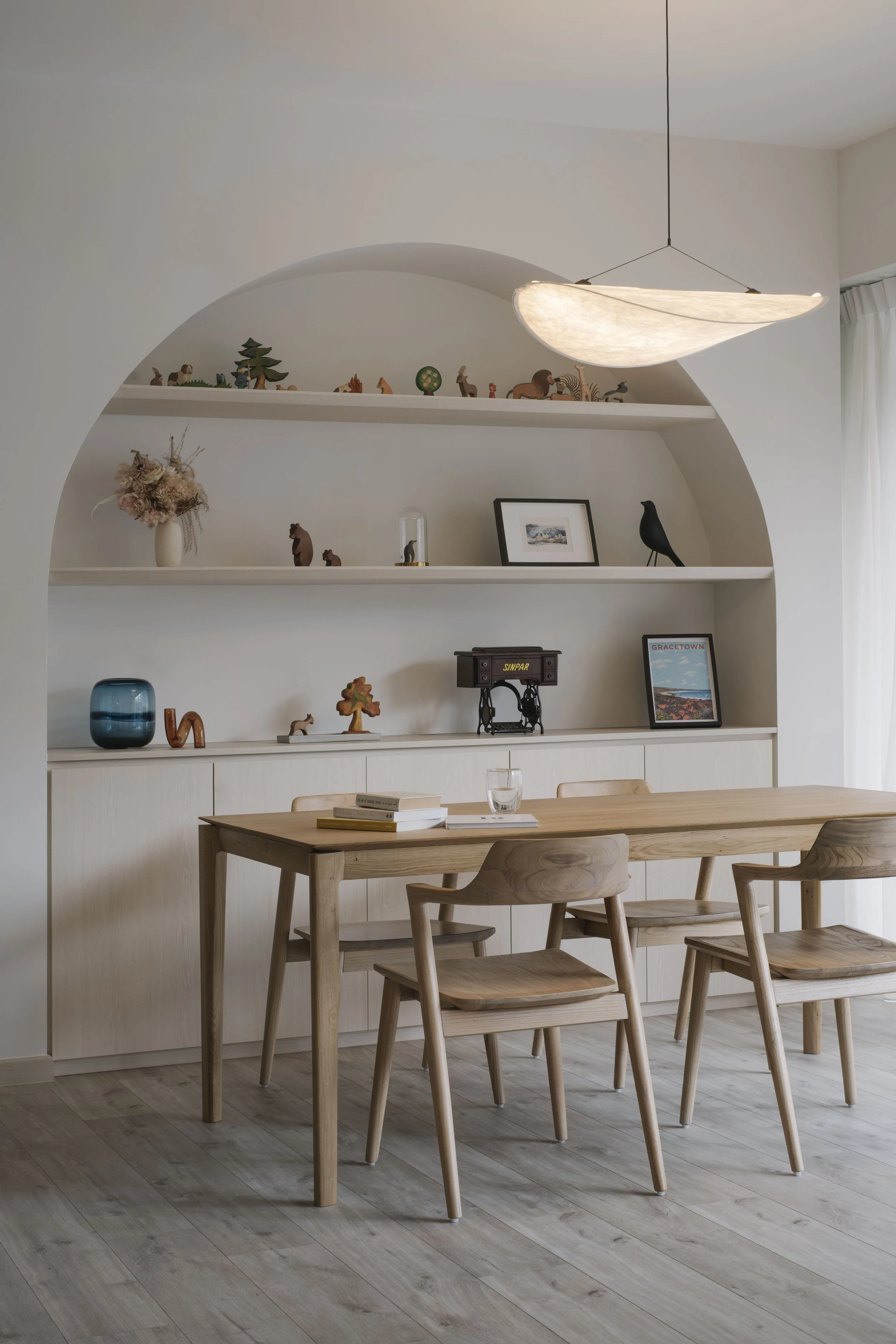 In 2021, Lite Design Collaborative was commissioned to reimagine a resale condominium into a study of form, light, and restraint. The transformation centres on a sculptural curved display in the living area, conceived as both focal point and gesture of quiet expression. Its soft geometry is accentuated by the New Work Tense pendant, chosen for its delicate balance of lightness and structure.